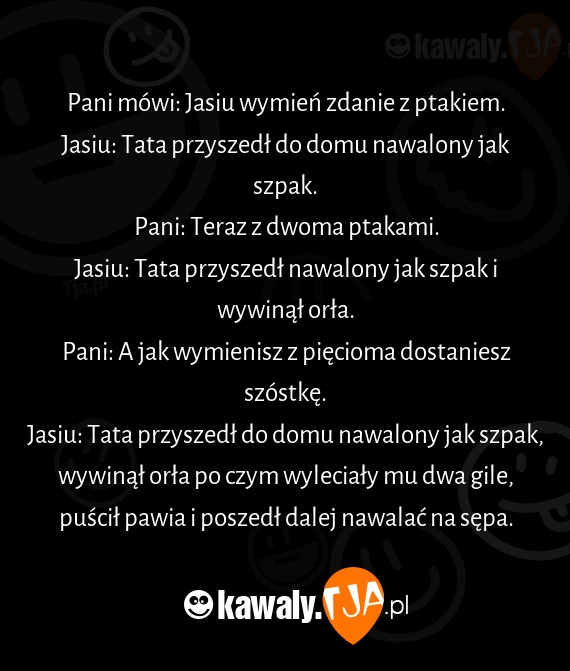 Jasiu: Tata przyszedł do domu nawalony jak szpak, wywinął orła po czym wyleciały mu dwa gile, puścił pawia i poszedł dalej nawalać na sępa.