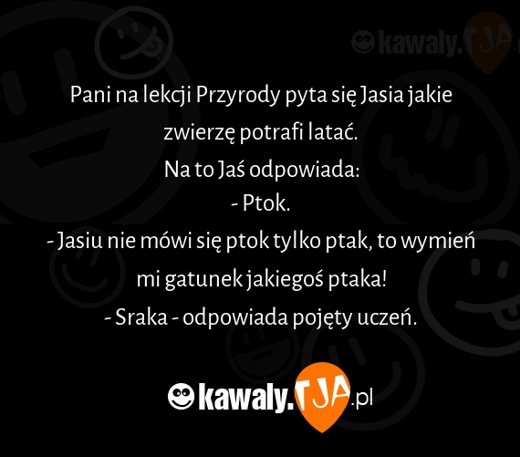 Pani na lekcji Przyrody pyta się Jasia jakie zwierzę potrafi latać. Na to Jaś odpowiada: - Ptok. - Jasiu nie mówi się ptok tylko ptak, to wymień mi gatunek jakiegoś ptaka! - Sraka - odpowiada pojęty uczeń.