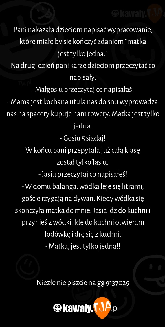 Pani nakazała dzieciom napisać wypracowanie, które miało by się kończyć zdaniem "matka jest tylko jedna."