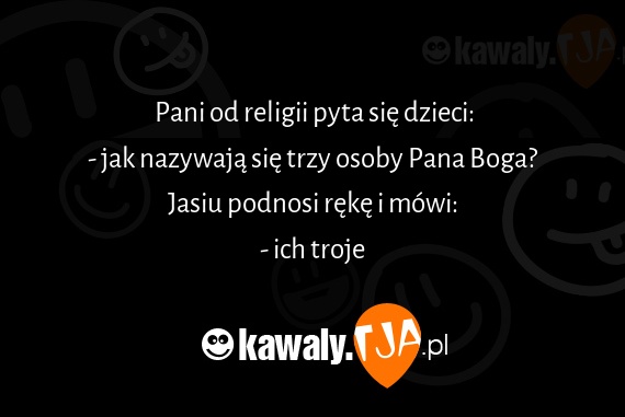 Pani od religii pyta się dzieci: - jak nazywają się trzy osoby Pana Boga? Jasiu podnosi rękę i mówi: - ich troje