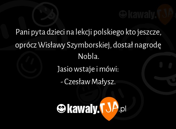 Pani pyta dzieci na lekcji polskiego kto jeszcze, oprócz Wisławy Szymborskiej, dostał nagrodę Nobla. Jasio wstaje i mówi: - Czesław Małysz.