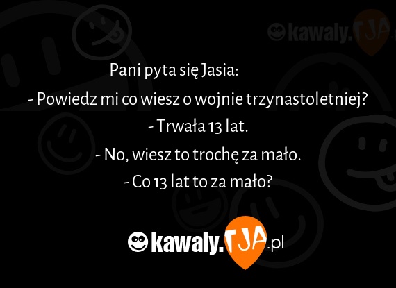 Pani pyta sie Jasia: - Powiedz mi co wiesz o wojnie trzynastoletniej? - Trwala 13 lat. - No, wiesz to troche za malo. - Co 13 lat to za malo?