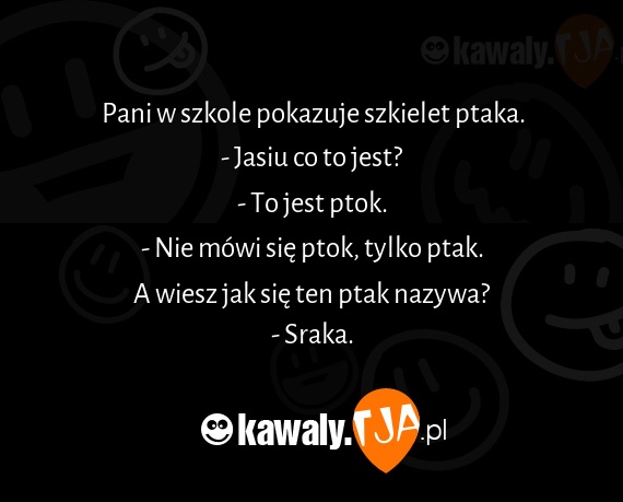 Pani w szkole pokazuje szkielet ptaka. - Jasiu co to jest? - To jest ptok. - Nie mowi sie ptok, tylko ptak. A wiesz jak sie ten ptak nazywa? - Sraka.