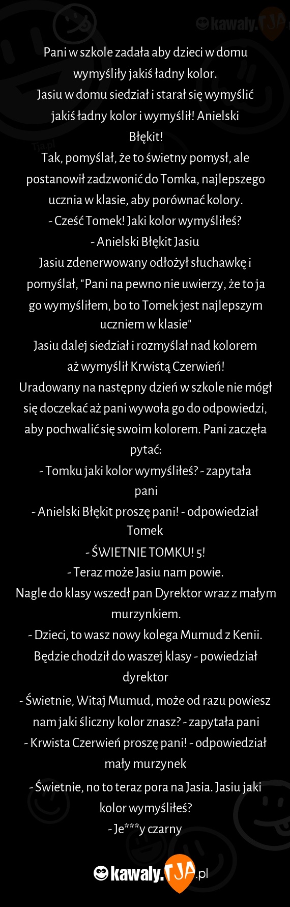 Uradowany na następny dzień w szkole nie mógł się doczekać aż pani wywoła go do odpowiedzi, aby pochwalić się swoim kolorem. Pani zaczęła pytać: