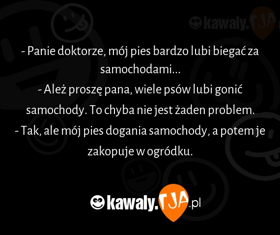 - Panie doktorze, mój pies bardzo lubi biegać za samochodami... - Ależ proszę pana, wiele psów lubi gonić samochody. To chyba nie jest żaden problem. - Tak, ale mój pies dogania samochody, a potem je zakopuje w ogródku.