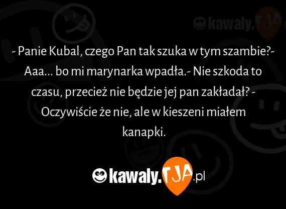 - Panie Kubal, czego Pan tak szuka w tym szambie?- Aaa... bo mi marynarka wpadła.- Nie szkoda to czasu, przecież nie będzie jej pan zakładał? - Oczywiście że nie, ale w kieszeni miałem kanapki.