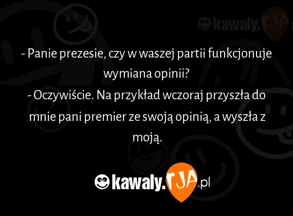 - Panie prezesie, czy w waszej partii funkcjonuje wymiana opinii? - Oczywiście. Na przykład wczoraj przyszła do mnie pani premier ze swoją opinią, a wyszła z moją.