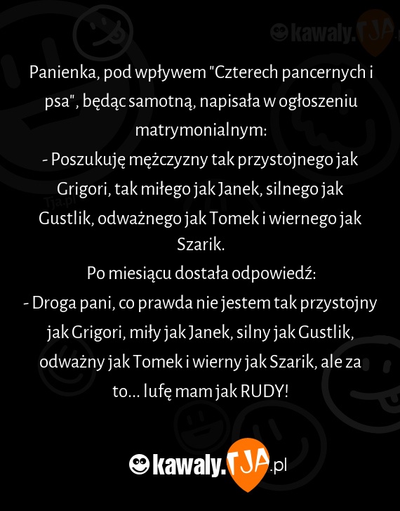 Panienka, pod wpływem "Czterech pancernych i psa", będąc samotną, napisała w ogłoszeniu matrymonialnym: