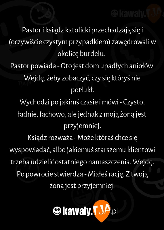 Pastor i ksiądz katolicki przechadzają się i (oczywiście czystym przypadkiem) zawędrowali w okolicę burdelu.