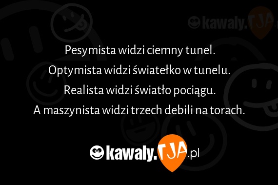 Pesymista widzi ciemny tunel. Optymista widzi swiatelko w tunelu. Realista widzi swiatlo pociagu. A maszynista widzi trzech debili na torach.