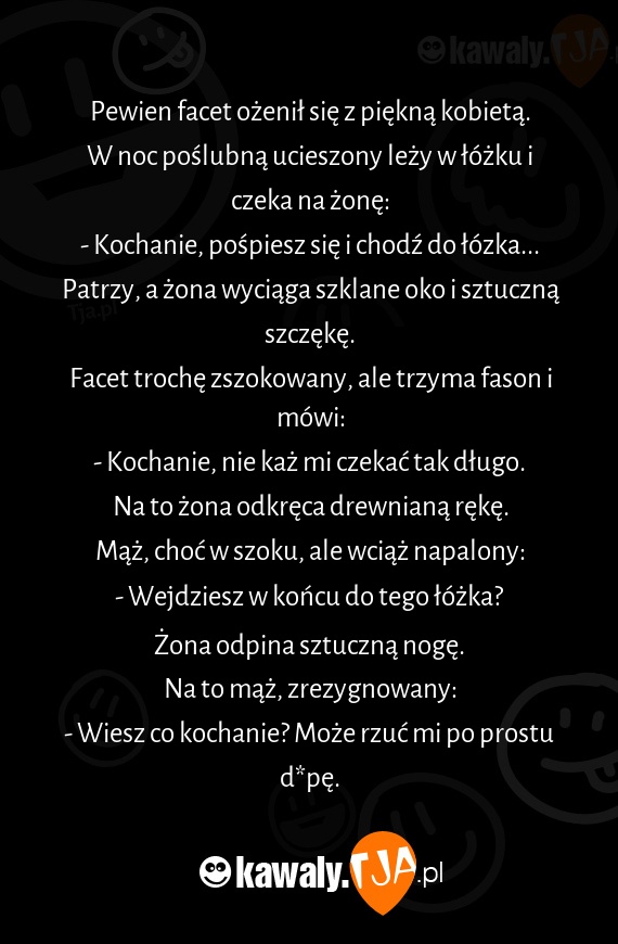 W noc poślubną ucieszony leży w łóżku i czeka na żonę: