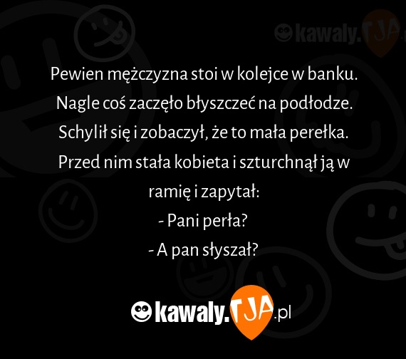 Pewien mężczyzna stoi w kolejce w banku. Nagle coś zaczęło błyszczeć na podłodze. Schylił się i zobaczył, że to mała perełka. Przed nim stała kobieta i szturchnął ją w ramię i zapytał: - Pani perła? - A pan słyszał?