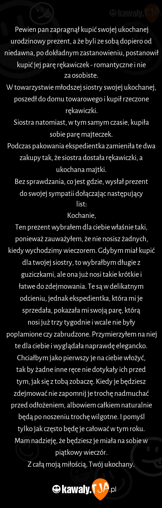 Bez sprawdzania, co jest gdzie, wysłał prezent do swojej sympatii dołączając następujący list: