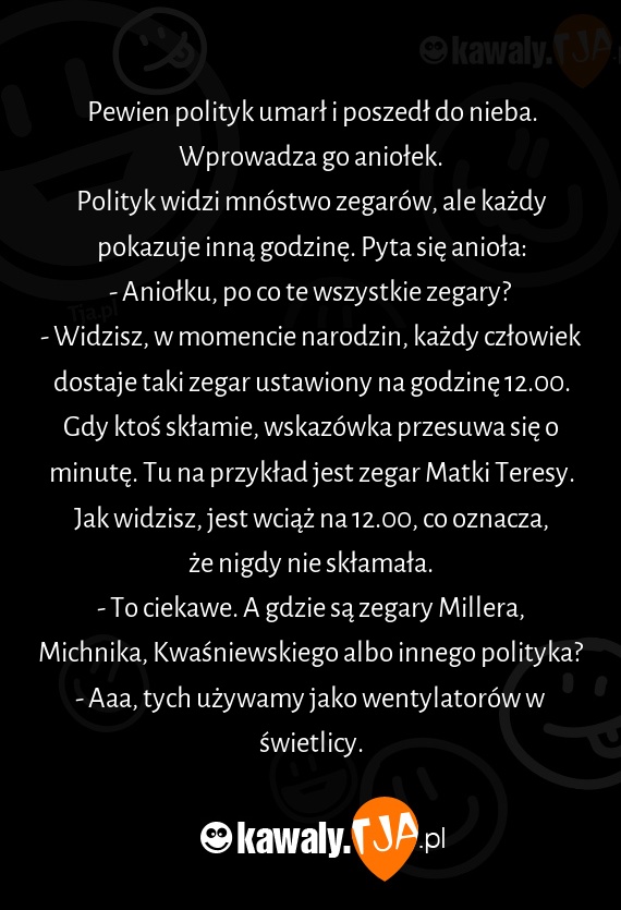Polityk widzi mnóstwo zegarów, ale każdy pokazuje inną godzinę. Pyta się anioła: