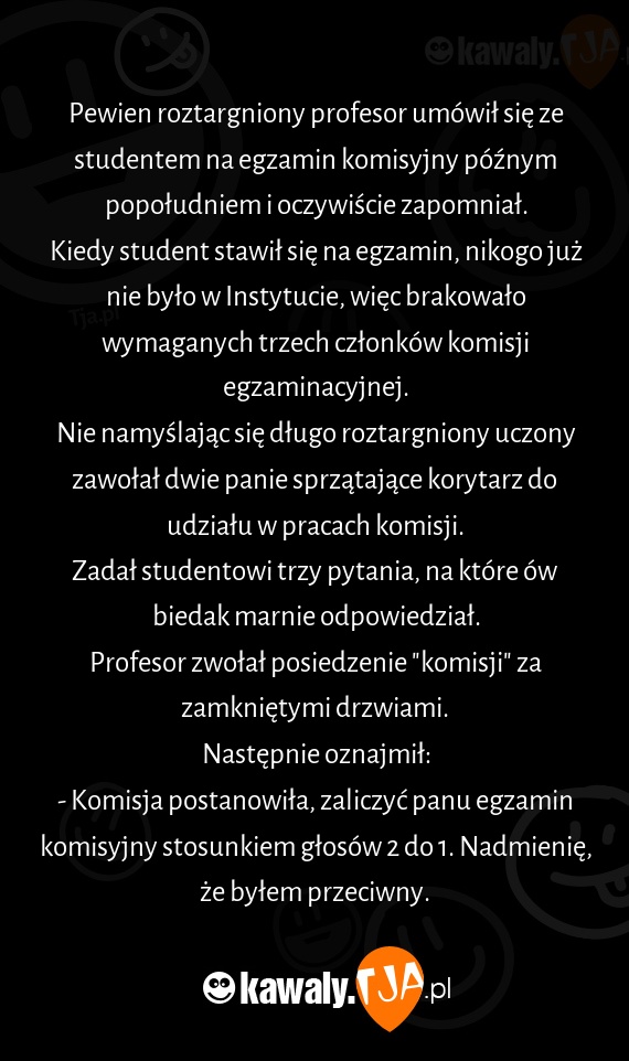 - Komisja postanowiła, zaliczyć panu egzamin komisyjny stosunkiem głosów 2 do 1. Nadmienię, że byłem przeciwny.