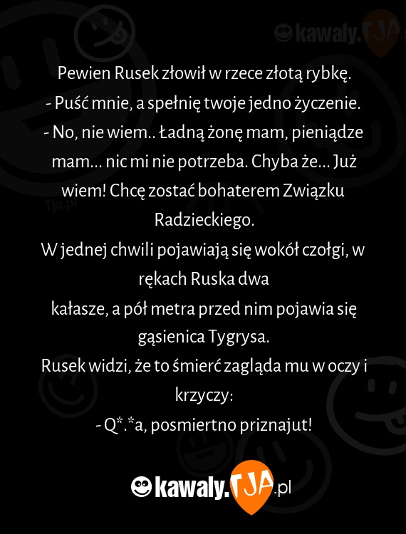 - No, nie wiem.. Ładną żonę mam, pieniądze mam... nic mi nie potrzeba. Chyba że... Już wiem! Chcę zostać bohaterem Związku Radzieckiego.