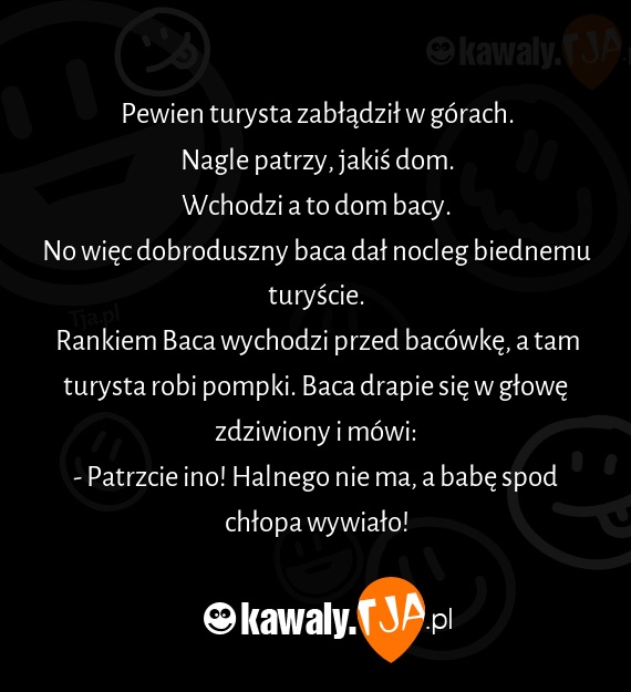 Rankiem Baca wychodzi przed bacówkę, a tam turysta robi pompki. Baca drapie się w głowę zdziwiony i mówi: