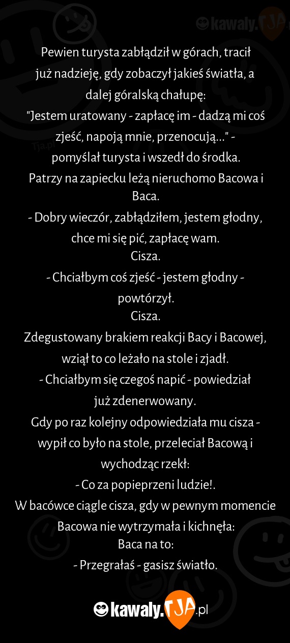Pewien turysta zabłądził w górach, tracił już nadzieję, gdy zobaczył jakieś światła, a dalej góralską chałupę: