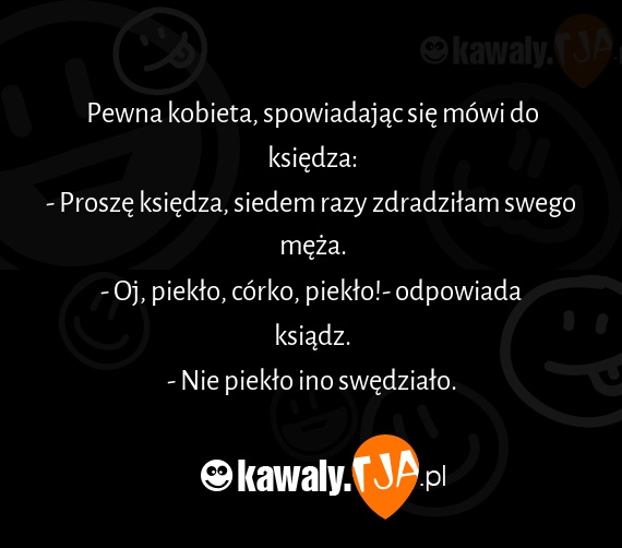 Pewna kobieta, spowiadając się mówi do księdza: - Proszę księdza, siedem razy zdradziłam swego męża. - Oj, piekło, córko, piekło!- odpowiada ksiądz. - Nie piekło ino swędziało.
