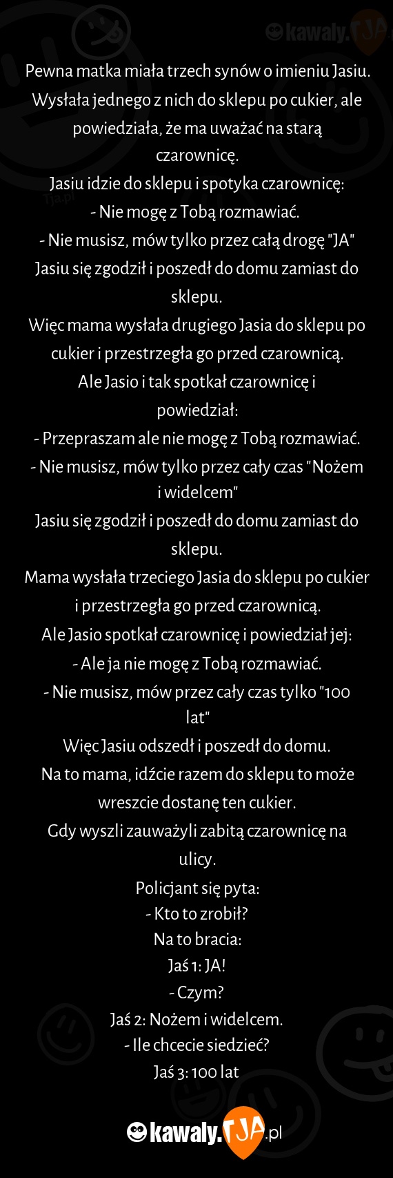 Mama wysłała trzeciego Jasia do sklepu po cukier i przestrzegła go przed czarownicą.
