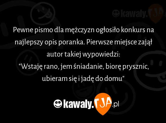 Pewne pismo dla mezczyzn oglosilo konkurs na najlepszy opis poranka. Pierwsze miejsce zajal autor takiej wypowiedzi: "Wstaje rano, jem sniadanie, biore prysznic, ubieram sie i jade do domu"