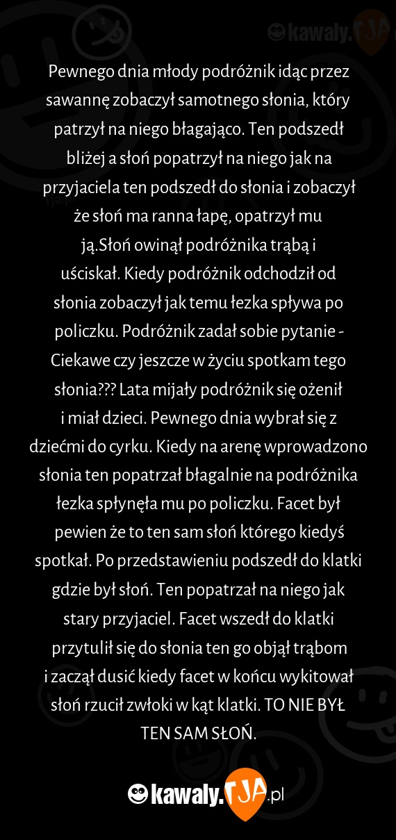 Pewnego dnia młody podróżnik idąc przez sawannę zobaczył samotnego słonia, który patrzył na niego błagająco. Ten podszedł bliżej a słoń popatrzył na niego jak na przyjaciela ten podszedł do słonia i zobaczył że słoń ma ranna łapę, opatrzył mu ją.Słoń owinął podróżnika trąbą i uściskał. Kiedy podróżnik odchodził od słonia zobaczył jak temu łezka spływa po policzku. Podróżnik zadał sobie pytanie - Ciekawe czy jeszcze w życiu spotkam tego słonia??? Lata mijały podróżnik się ożenił i miał dzieci. Pewnego dnia wybrał się z dziećmi do cyrku. Kiedy na arenę wprowadzono słonia ten popatrzał błagalnie na podróżnika łezka spłynęła mu po policzku. Facet był pewien że to ten sam słoń którego kiedyś spotkał. Po przedstawieniu podszedł do klatki gdzie był słoń. Ten popatrzał na niego jak stary przyjaciel. Facet wszedł do klatki przytulił się do słonia ten go objął trąbom i zaczął dusić kiedy facet w końcu wykitował słoń rzucił zwłoki w kąt klatki. TO NIE BYŁ TEN SAM SŁOŃ.
