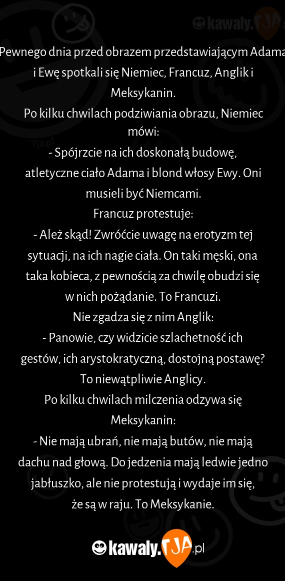 Pewnego dnia przed obrazem przedstawiającym Adama i Ewę spotkali się Niemiec, Francuz, Anglik i Meksykanin.