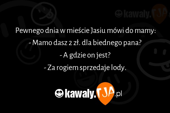Pewnego dnia w miescie Jasiu mowi do mamy: - Mamo dasz 2 zl. dla biednego pana? - A gdzie on jest? - Za rogiem sprzedaje lody.