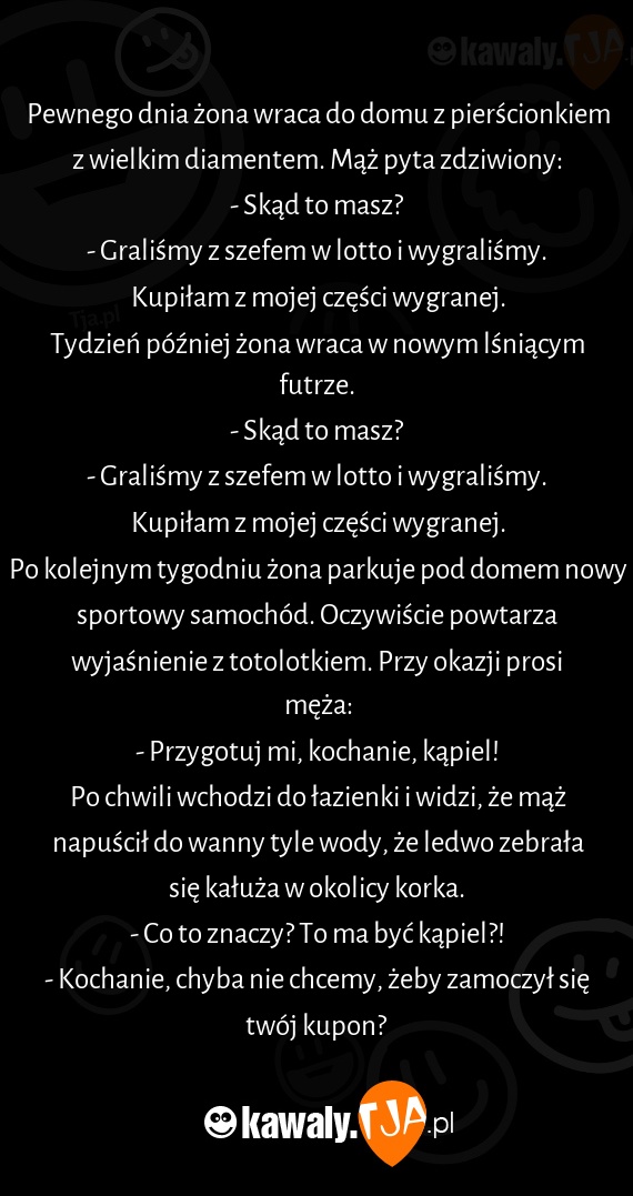Pewnego dnia żona wraca do domu z pierścionkiem z wielkim diamentem. Mąż pyta zdziwiony: