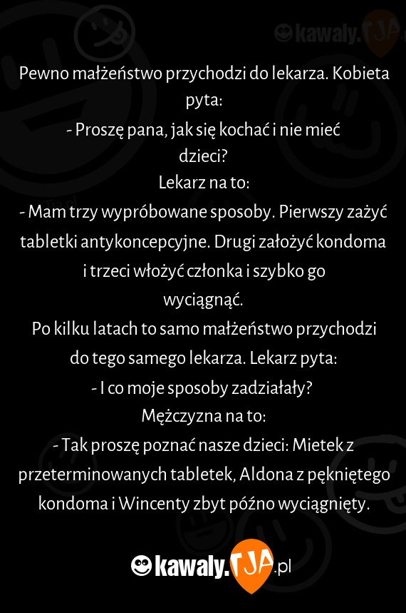 - Tak proszę poznać nasze dzieci: Mietek z przeterminowanych tabletek, Aldona z pękniętego kondoma i Wincenty zbyt późno wyciągnięty.