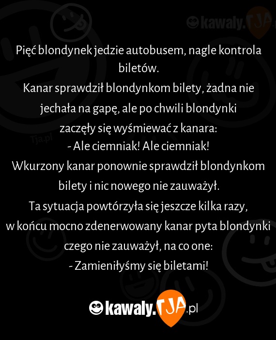 Kanar sprawdził blondynkom bilety, żadna nie jechała na gapę, ale po chwili blondynki zaczęły się wyśmiewać z kanara: