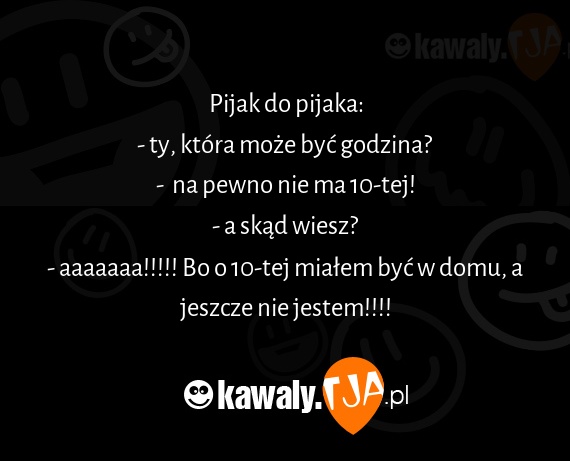 Pijak do pijaka: - ty, która może być godzina? - na pewno nie ma 10-tej! - a skąd wiesz? - aaaaaaa!!!!! Bo o 10-tej miałem być w domu, a jeszcze nie jestem!!!!