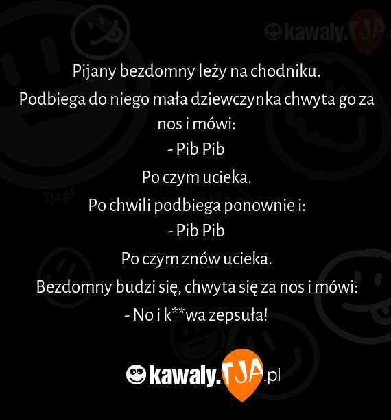 Pijany bezdomny leży na chodniku. Podbiega do niego mała dziewczynka chwyta go za nos i mówi: - Pib Pib Po czym ucieka. Po chwili podbiega ponownie i: - Pib Pib Po czym znów ucieka. Bezdomny budzi się, chwyta się za nos i mówi: - No i k**wa zepsuła!