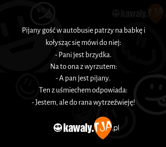 Pijany gość w autobusie patrzy na babkę i kołysząc się mówi do niej: - Pani jest brzydka. Na to ona z wyrzutem: - A pan jest pijany. Ten z uśmiechem odpowiada: - Jestem, ale do rana wytrzeźwieję!