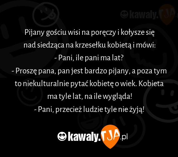 - Proszę pana, pan jest bardzo pijany, a poza tym to niekulturalnie pytać kobietę o wiek. Kobieta ma tyle lat, na ile wygląda!