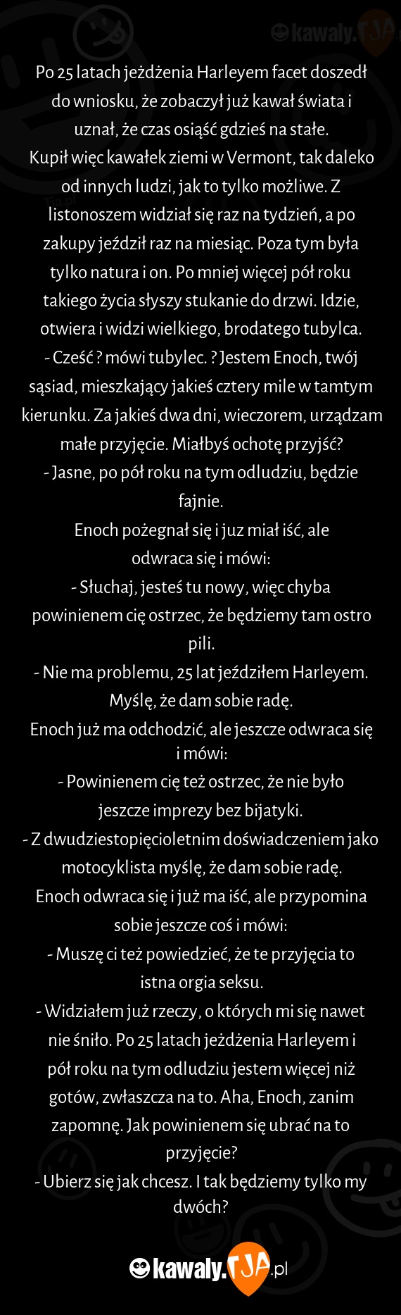 - Cześć ? mówi tubylec. ? Jestem Enoch, twój sąsiad, mieszkający jakieś cztery mile w tamtym kierunku. Za jakieś dwa dni, wieczorem, urządzam małe przyjęcie. Miałbyś ochotę przyjść?