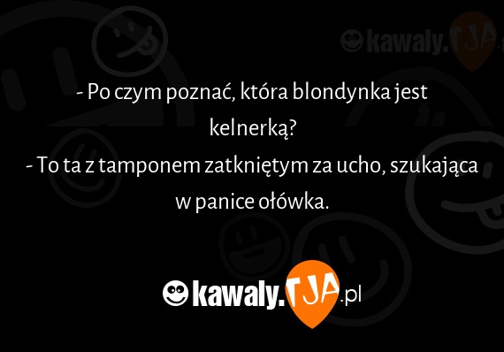 - Po czym poznac, ktora blondynka jest kelnerka? - To ta z tamponem zatknietym za ucho, szukajaca w panice olowka.