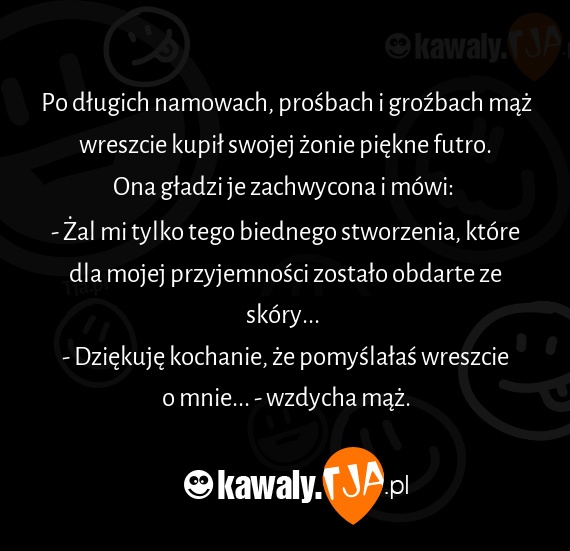 Po długich namowach, prośbach i groźbach mąż wreszcie kupił swojej żonie piękne futro.