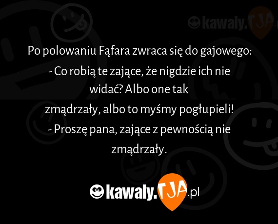 Po polowaniu Fafara zwraca sie do gajowego: - Co robia te zajace, ze nigdzie ich nie widac? Albo one tak zmadrzaly, albo to mysmy poglupieli! - Prosze pana, zajace z pewnoscia nie zmadrzaly.