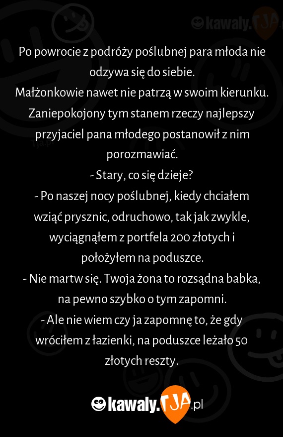 Po powrocie z podróży poślubnej para młoda nie odzywa się do siebie.