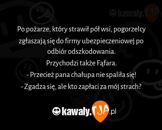 [url=https://kawaly.tja.pl/dowcip,po-pozarze-ktory-strawil-pol-wsi]Po pożarze, który strawił pół wsi, pogorzelcy zgłaszają się do firmy ubezpieczeniowej po odbiór odszkodowania.