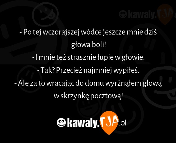 - Po tej wczorajszej wódce jeszcze mnie dziś głowa boli! - I mnie też strasznie łupie w głowie. - Tak? Przecież najmniej wypiłeś. - Ale za to wracając do domu wyrżnąłem głową w skrzynkę pocztową!