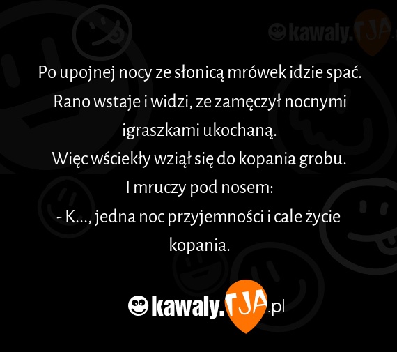 Po upojnej nocy ze słonicą mrówek idzie spać. Rano wstaje i widzi, ze zamęczył nocnymi igraszkami ukochaną. Więc wściekły wziął się do kopania grobu. I mruczy pod nosem: - K..., jedna noc przyjemności i cale życie kopania.