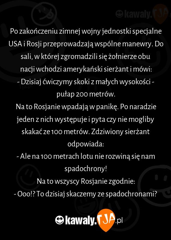 Na to Rosjanie wpadają w panikę. Po naradzie jeden z nich występuje i pyta czy nie mogliby skakać ze 100 metrów. Zdziwiony sierżant odpowiada: