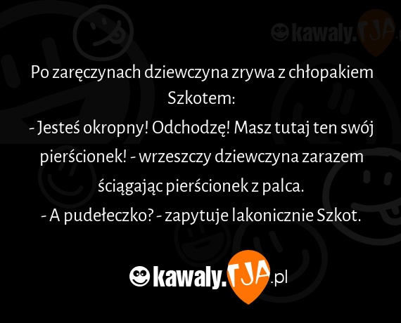 Po zaręczynach dziewczyna zrywa z chłopakiem Szkotem: - Jesteś okropny! Odchodzę! Masz tutaj ten swój pierścionek! - wrzeszczy dziewczyna zarazem ściągając pierścionek z palca. - A pudełeczko? - zapytuje lakonicznie Szkot.