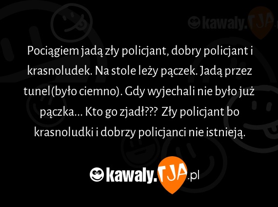 Pociagiem jada zly policjant, dobry policjant i krasnoludek. Na stole lezy paczek. Jada przez tunel(bylo ciemno). Gdy wyjechali nie bylo juz paczka... Kto go zjadl??? Zly policjant bo krasnoludki i dobrzy policjanci nie istnieja.