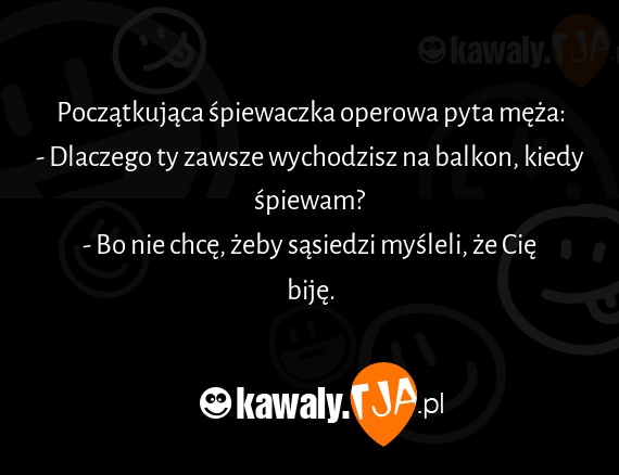 Poczatkujaca spiewaczka operowa pyta meza: - Dlaczego ty zawsze wychodzisz na balkon, kiedy spiewam? - Bo nie chce, zeby sasiedzi mysleli, ze Cie bije.