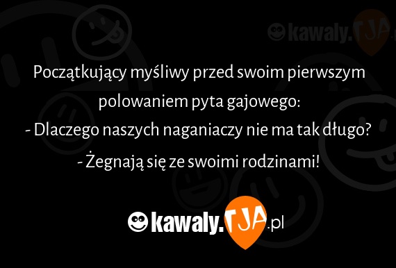 Początkujący myśliwy przed swoim pierwszym polowaniem pyta gajowego: - Dlaczego naszych naganiaczy nie ma tak długo? - Żegnają się ze swoimi rodzinami!