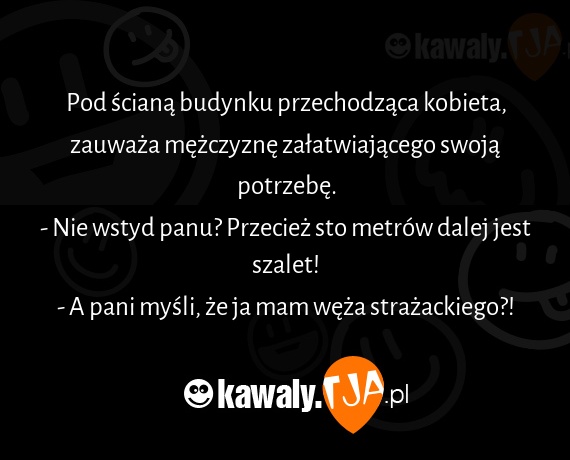 Pod ścianą budynku przechodząca kobieta, zauważa mężczyznę załatwiającego swoją potrzebę. - Nie wstyd panu? Przecież sto metrów dalej jest szalet! - A pani myśli, że ja mam węża strażackiego?!