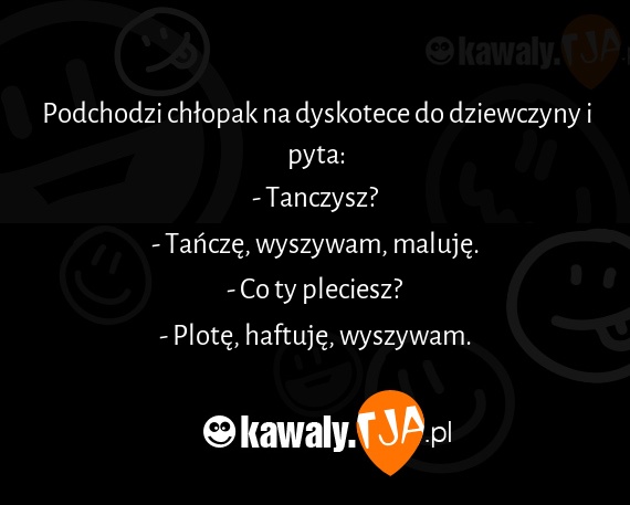Podchodzi chłopak na dyskotece do dziewczyny i pyta: - Tanczysz? - Tańczę, wyszywam, maluję. - Co ty pleciesz? - Plotę, haftuję, wyszywam.